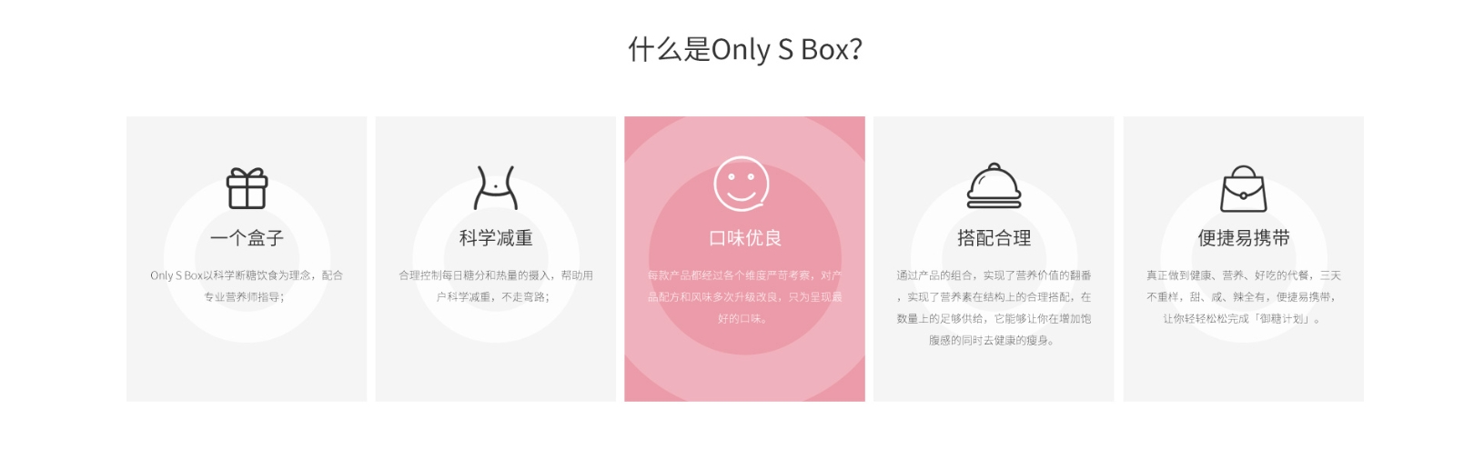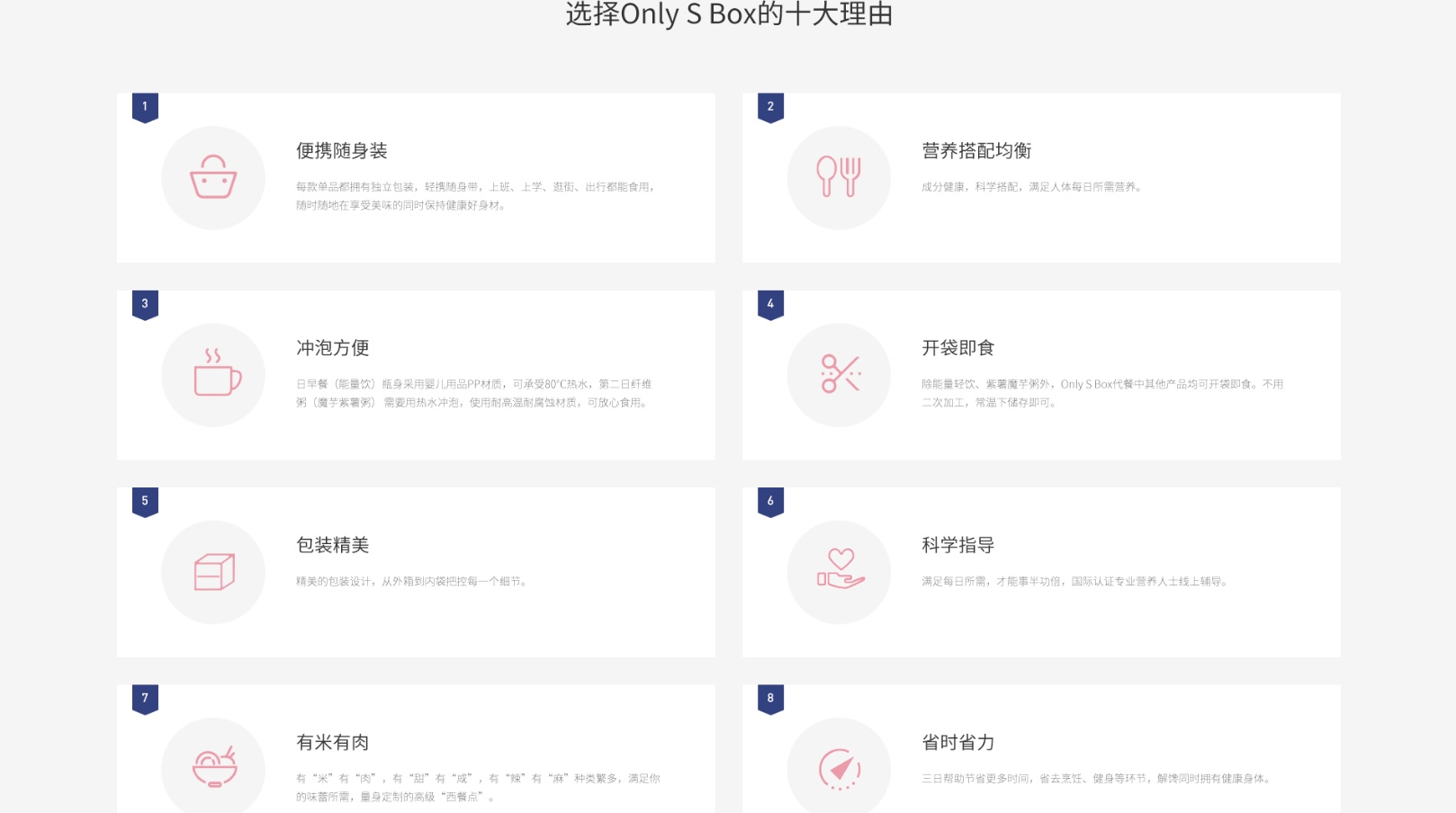 核心功能一目了然:通過(guò)簡(jiǎn)潔的模塊設計,用圖文結合的方式快速介紹產(chǎn)品的核心價(jià)值,比如“全套服務(wù)”或者“科學(xué)配餐”等。