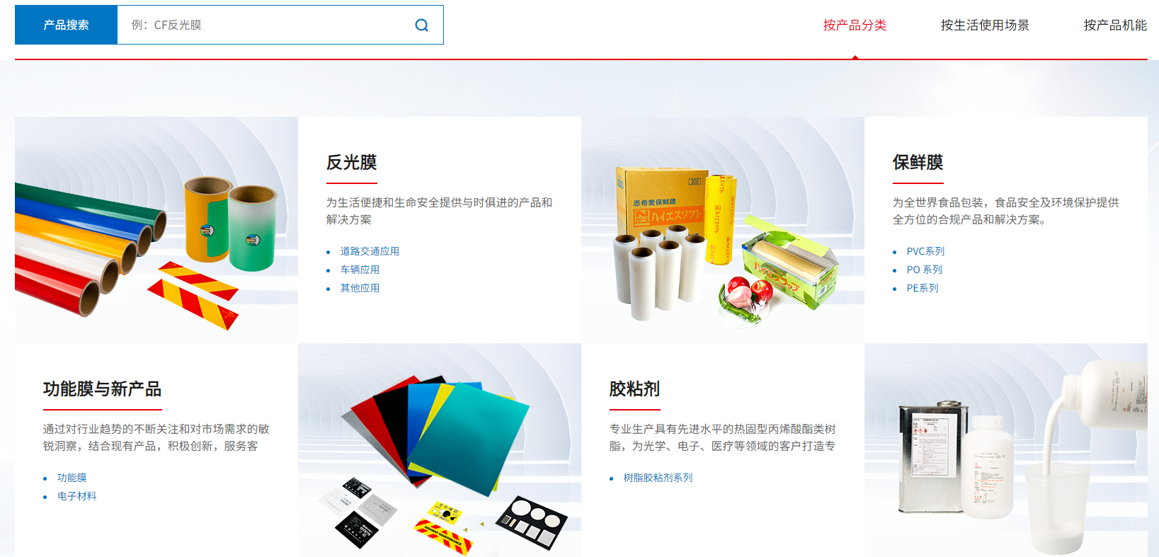 產(chǎn)品中心 – 分類(lèi)展示反光膜、保鮮膜、功能膜、膠粘劑等產(chǎn)品,并支持搜索功能,幫助用戶(hù)精準查找。