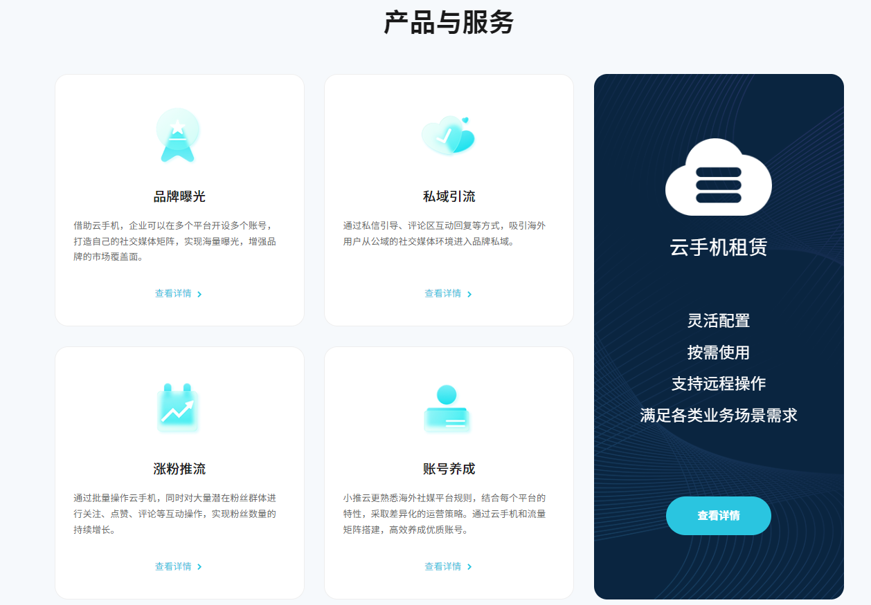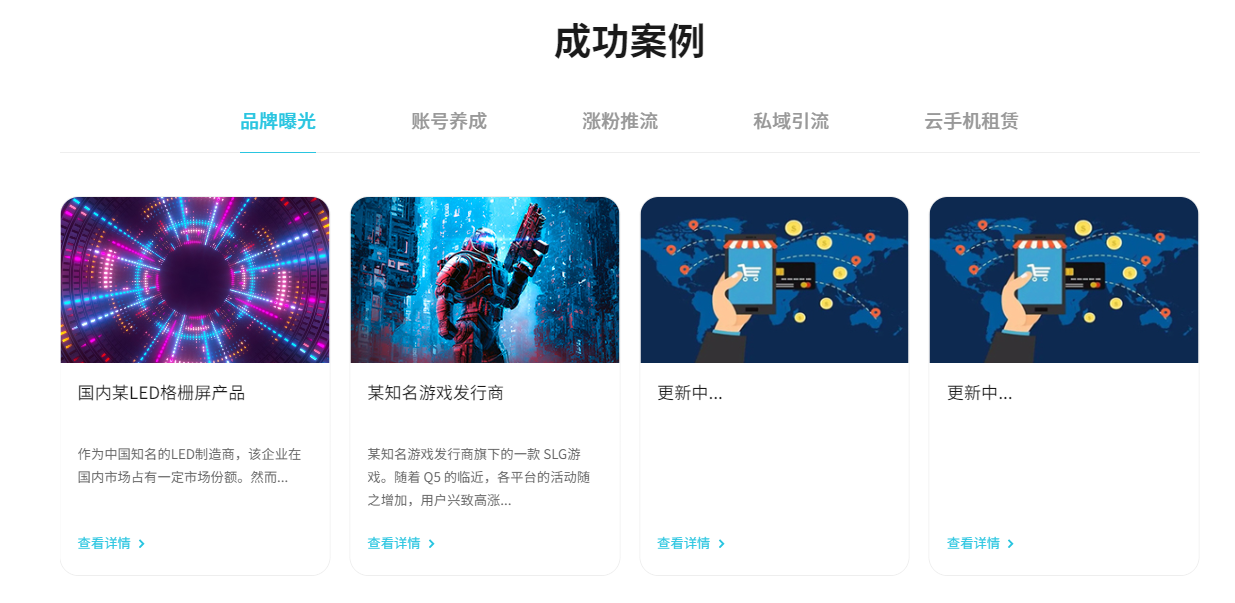 該網(wǎng)站通過(guò)簡(jiǎn)潔明了的展示,幫助用戶(hù)快速了解其提供的云手機租賃、品牌曝光、賬號養成等服務(wù)。這種清晰的服務(wù)分類(lèi)不僅讓用戶(hù)快速識別出自己需求的解決方案,還大大提高了網(wǎng)站的轉化率。通過(guò)精簡(jiǎn)內容和直觀(guān)的展示,客戶(hù)能夠迅速找到合適的服務(wù),無(wú)需繁瑣的篩選或深度了解,大大提升了用戶(hù)體驗和服務(wù)效率。