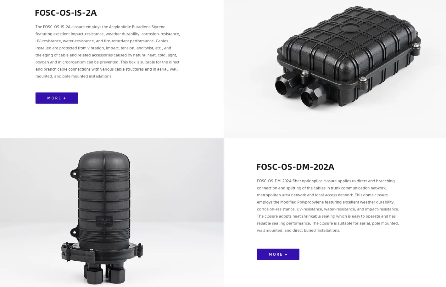 主要展示 光纖接頭盒、光纖分線(xiàn)盒等通信設備,每款產(chǎn)品都有圖片、簡(jiǎn)要介紹及“MORE”按鈕,方便用戶(hù)深入了解。