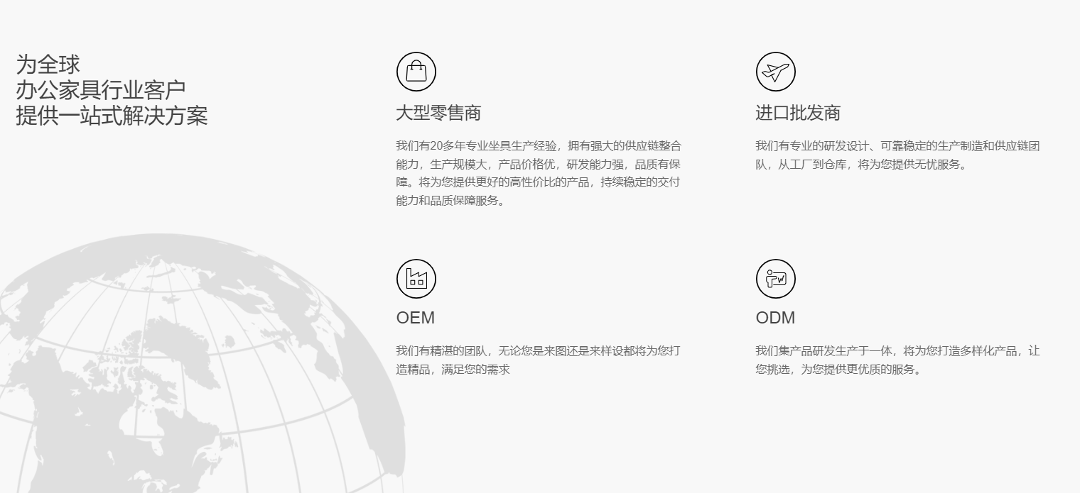 大標題直接說(shuō)出服務(wù)核心:“專(zhuān)業(yè)優(yōu)質(zhì)的健康坐具研發(fā)制造系統提供商”