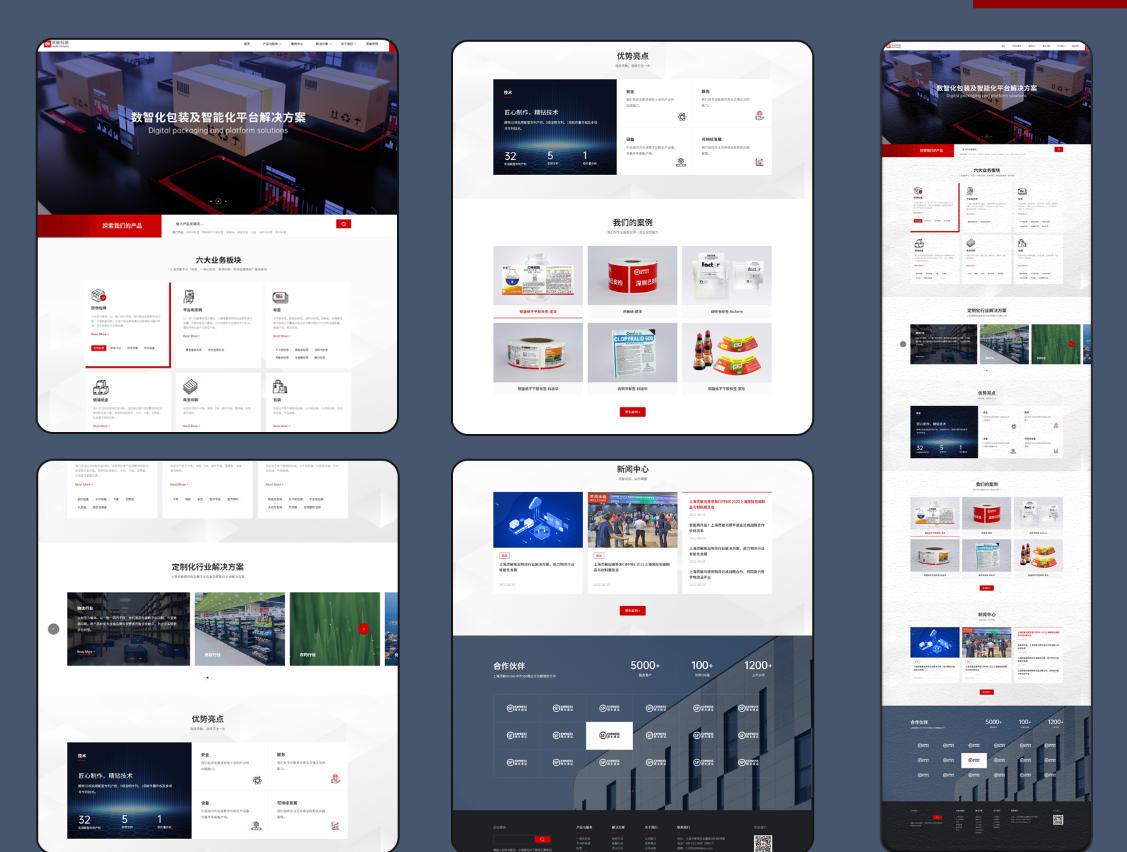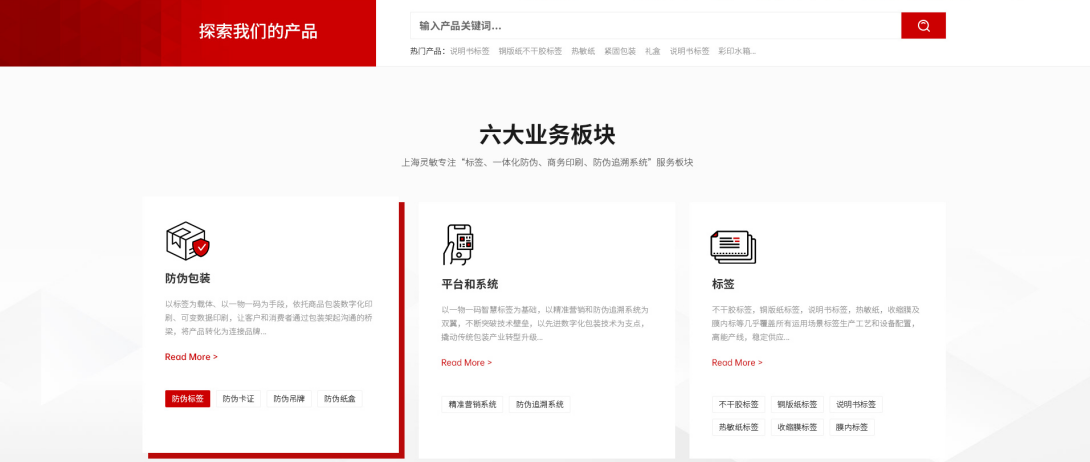 網(wǎng)站設有六大業(yè)務(wù)板塊,涵蓋防偽包裝、平臺系統、標簽、紙箱結構、商業(yè)印刷、成品包裝等,通過(guò)卡片式設計簡(jiǎn)潔明了地展示每項服務(wù)內容,便于B端客戶(hù)快速理解企業(yè)服務(wù)能力。