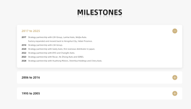 “Milestones” 采用時(shí)間軸樣式,層級清晰,重點(diǎn)突出企業(yè)與多家知名車(chē)企合作,傳遞行業(yè)背書(shū)與市場(chǎng)積累。