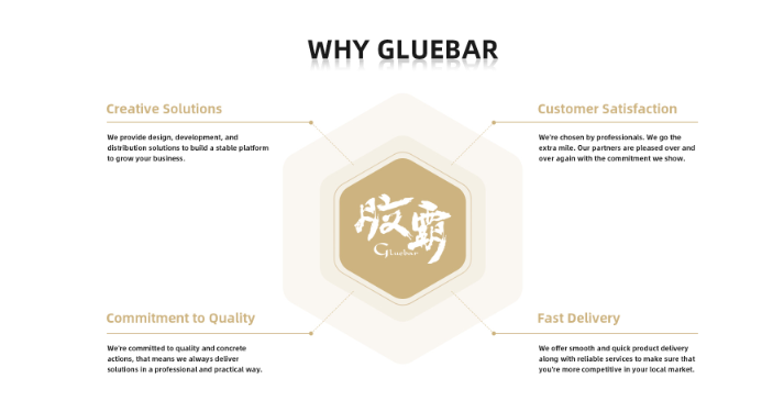 “WHY GLUEBAR”板塊用四個(gè)關(guān)鍵詞(解決方案、質(zhì)量、客戶(hù)滿(mǎn)意、交付效率)展現品牌核心價(jià)值。
