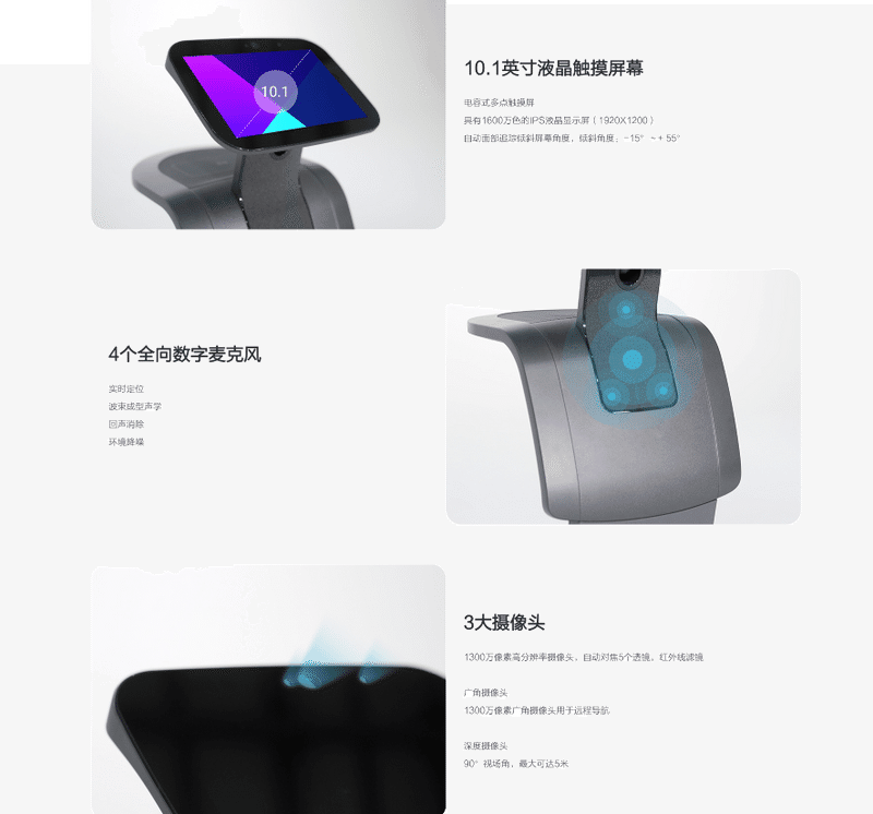 服務(wù)機器人產(chǎn)品頁(yè)圍繞外觀(guān)設計、屏幕、攝像頭、雷達傳感器等核心賣(mài)點(diǎn),分段式直觀(guān)展示,強化產(chǎn)品硬實(shí)力表達,滿(mǎn)足潛在客戶(hù)對技術(shù)參數與實(shí)際應用的多重關(guān)注點(diǎn)。