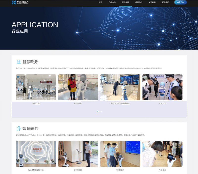 “行業(yè)應用”版塊采用圖文輪播與場(chǎng)景化案例結合方式,涵蓋智慧政務(wù)、智慧養老、文旅、工業(yè)、展廳等多個(gè)行業(yè),增強訪(fǎng)客對落地能力的感知,實(shí)現從“技術(shù)”到“使用”的轉化。