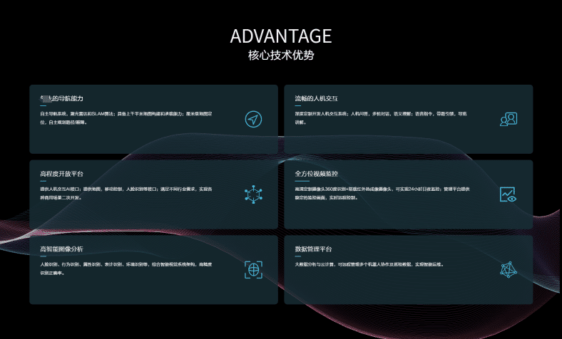 首頁(yè)“ADVANTAGE”區域采用雙列卡片式排布,結合圖標與簡(jiǎn)明描述,高效傳達AI語(yǔ)義識別、圖像識別、平臺開(kāi)放等核心能力,提升用戶(hù)對品牌的專(zhuān)業(yè)認知度。