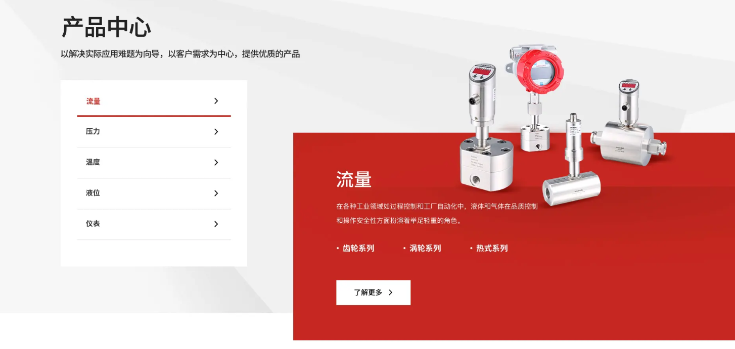 產(chǎn)品中心:采用“流量/壓力/溫度/液位”四大類(lèi)清晰分組,結構簡(jiǎn)明,便于工程師按需索引;