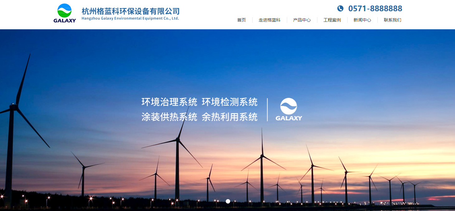 網(wǎng)站首頁(yè)通過(guò)大幅風(fēng)電背景圖傳達企業(yè)綠色可持續的行業(yè)定位,同時(shí)配以“環(huán)境治理系統 / 環(huán)境檢測系統 / 涂裝供熱系統 / 余熱利用系統”等核心關(guān)鍵詞,直接突出業(yè)務(wù)主線(xiàn)。