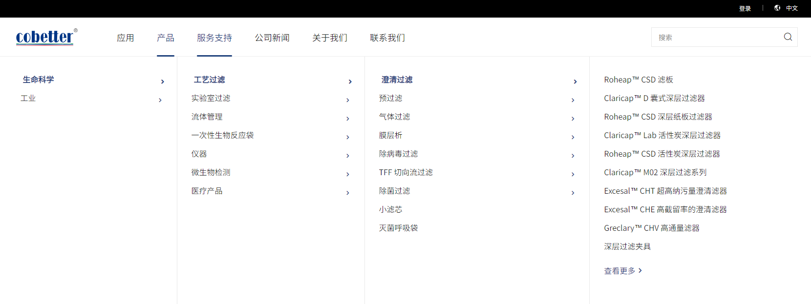這是一個(gè)典型的多級 Mega Menu 下拉導航,鼠標懸停后展開(kāi)多個(gè)橫向分欄。每一列代表一個(gè)產(chǎn)品分類(lèi)層級,從最左側的“應用場(chǎng)景”(如生命科學(xué)、工業(yè))開(kāi)始,逐步向右展開(kāi)工藝類(lèi)別、具體子類(lèi),最終到右側列出具體的產(chǎn)品名稱(chēng)鏈接。