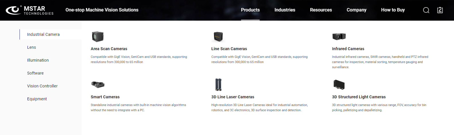 該網(wǎng)站采用的是圖文聯(lián)動(dòng)式導航。左側是產(chǎn)品分類(lèi)標簽(如工業(yè)相機、鏡頭、控制器等),右側是圖文卡片,每類(lèi)產(chǎn)品下展示數個(gè)子項,每項配圖并附帶簡(jiǎn)要文字說(shuō)明。