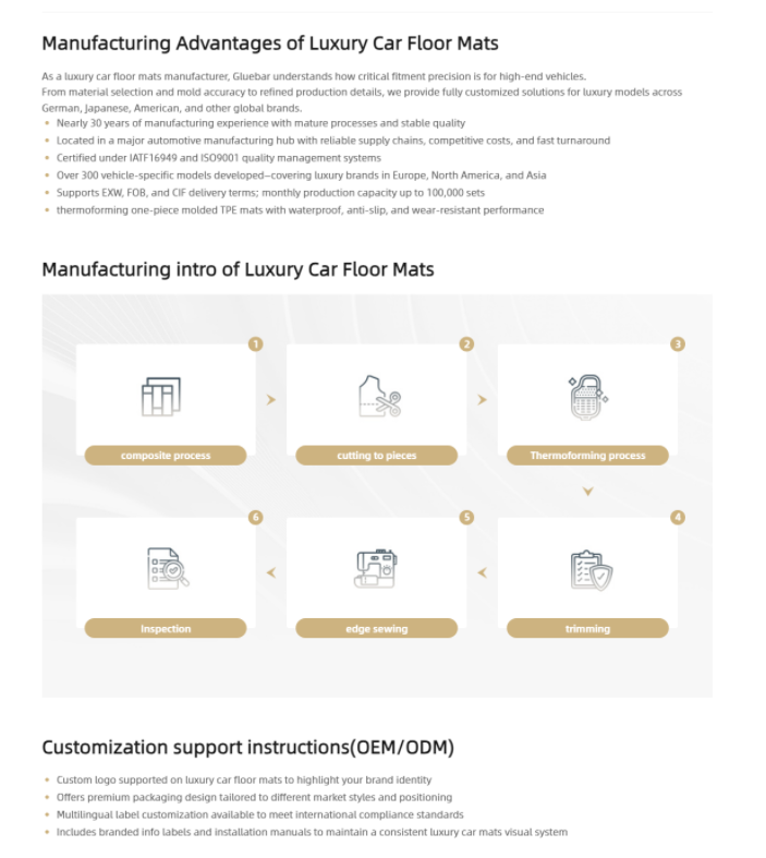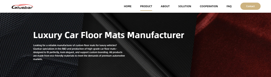 一打開(kāi) Gluebar 的腳墊頁(yè)面,最先映入眼簾的是黑色碳纖維紋理的背景,上面用白色大字寫(xiě)著(zhù) “Luxury Car Floor Mats Manufacturer”。