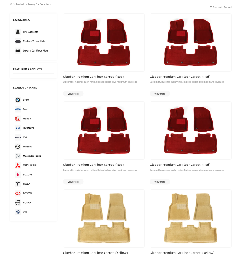 下面就是用戶(hù)最關(guān)心的腳墊圖片了。每行放 3 張卡片,每張卡片只顯示腳墊正反兩面的效果圖和簡(jiǎn)單名稱(chēng),卡片下方有一個(gè) “View More” 按鈕。