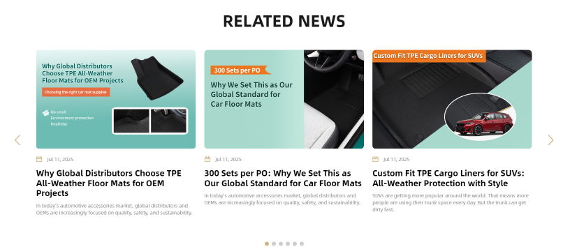 底部推薦了三篇行業(yè)文章,滑動(dòng)即可查看,既增加頁(yè)面趣味,也能讓客戶(hù)了解更多腳墊相關(guān)知識。