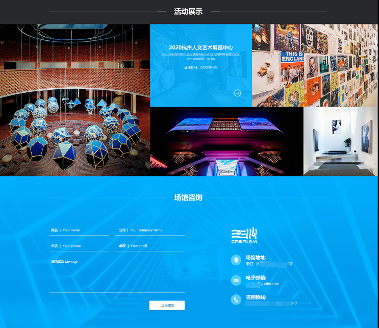 下部為觀(guān)眾預約、資料索取、聯(lián)系我們等信息整合
