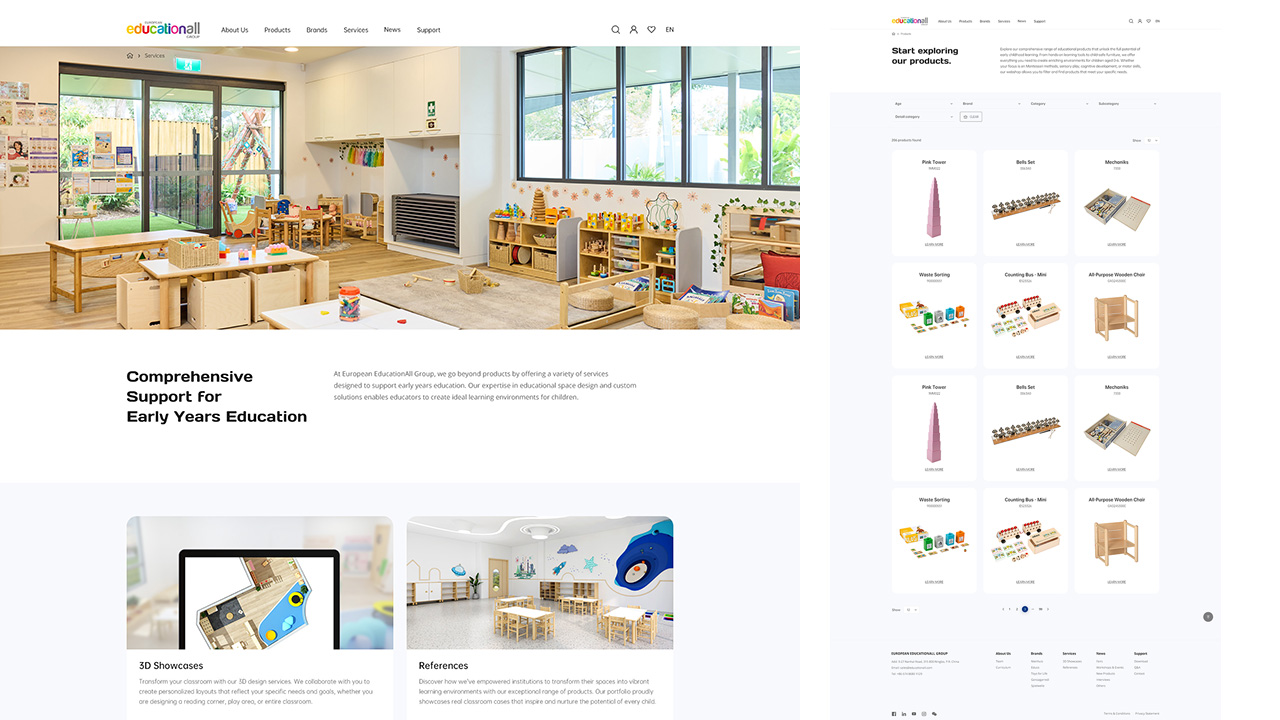 產(chǎn)品頁(yè)延續清晰的卡片式設計,信息結構井然有序。每一個(gè)產(chǎn)品都像擺放在整齊教室中的教材,真實(shí)、直觀(guān)、便于選擇。配合場(chǎng)景化照片,提升了沉浸感,也讓用戶(hù)能在瀏覽中獲得“專(zhuān)業(yè)與可靠”的信號。