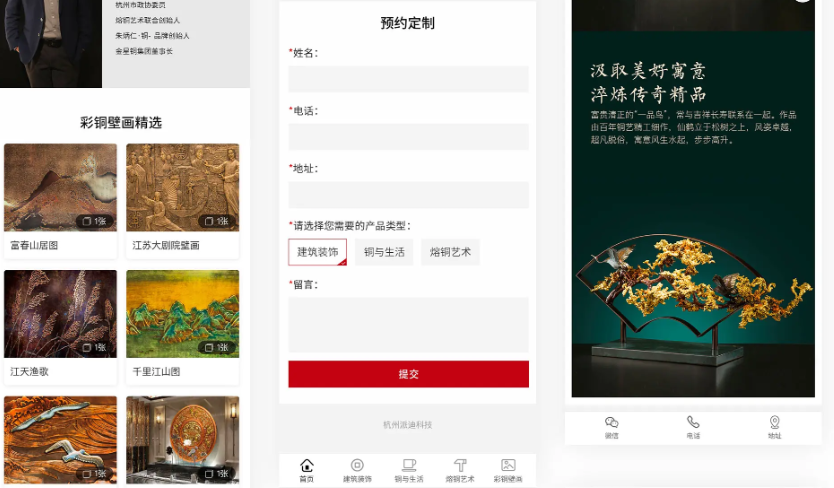 設置了簡(jiǎn)潔明了的“預約定制”表單,分類(lèi)清晰(頂級定制 / 銅藝生活 / 彩銅壁畫(huà)等),便于用戶(hù)快速選擇和提交需求,形成線(xiàn)索收集。
