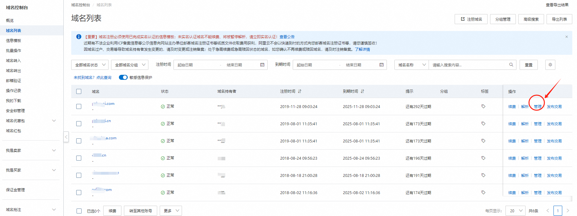2、打開(kāi)域名列表,點(diǎn)擊對應域名右側,管理