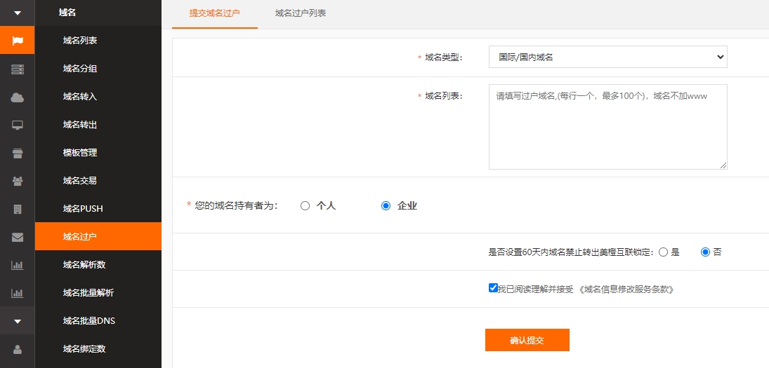 在域名管理頁(yè)面,找到“域名過(guò)戶(hù)”或“更改域名持有者”選項(不同注冊商名稱(chēng)可能略有不同)。