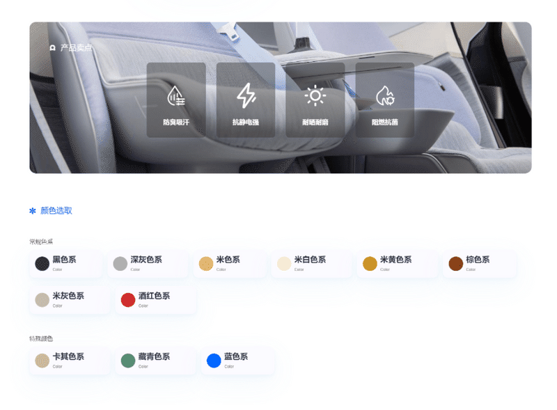 尤其值得一提的是“產(chǎn)品五維點(diǎn)”與“顏色選項”兩個(gè)版塊——通過(guò)圖標+文字的方式精準傳達性能賣(mài)點(diǎn),并利用豐富的色彩樣本卡強化產(chǎn)品實(shí)際可選項,使用戶(hù)獲得視覺(jué)+信息的雙重信賴(lài)感。