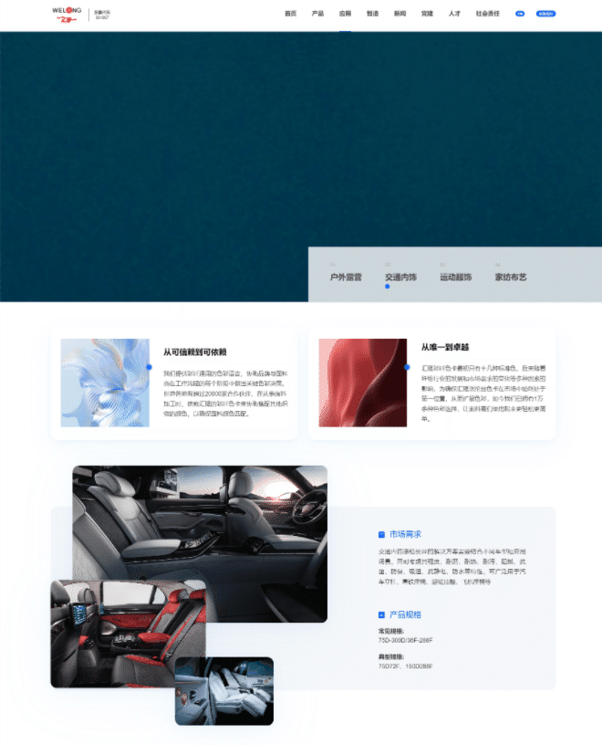 首頁(yè)圍繞“交通內飾”這一核心業(yè)務(wù),構建了兼具技術(shù)性與場(chǎng)景感的內容框架。從“戶(hù)外露營(yíng)、交通內飾、運動(dòng)服飾、家紡布藝”四大應用切換出發(fā),再到內飾展示、五大功能優(yōu)勢(除臭、熱輻射、耐磨、隔熱、阻燃),通過(guò)簡(jiǎn)潔明晰的模塊劃分,用戶(hù)無(wú)需翻找,即可直觀(guān)理解產(chǎn)品能力。