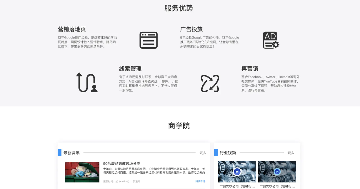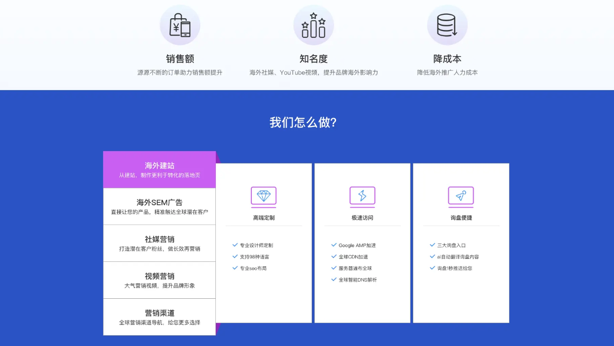 “我們怎么做”模塊采用圖文搭配分欄方式,對服務(wù)方案做分層解釋——從“海外建站”到“谷歌投放”到“線(xiàn)索管理”,清晰呈現解決方案結構;