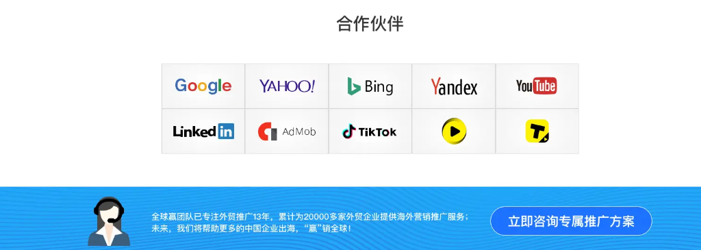合作伙伴展示欄引入國際大廠(chǎng)標志(Google、TikTok、LinkedIn等),迅速傳遞平臺實(shí)力與資源背景;