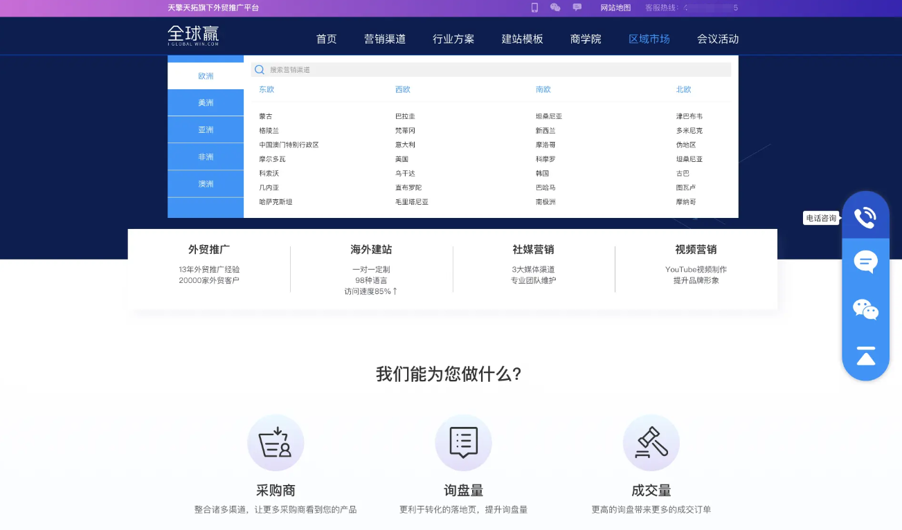 頭部導航條理清晰,分類(lèi)囊括:首頁(yè)、營(yíng)銷(xiāo)渠道、行業(yè)方案、建站系統、商學(xué)院等核心服務(wù),契合B2B買(mǎi)家的信息查找路徑;