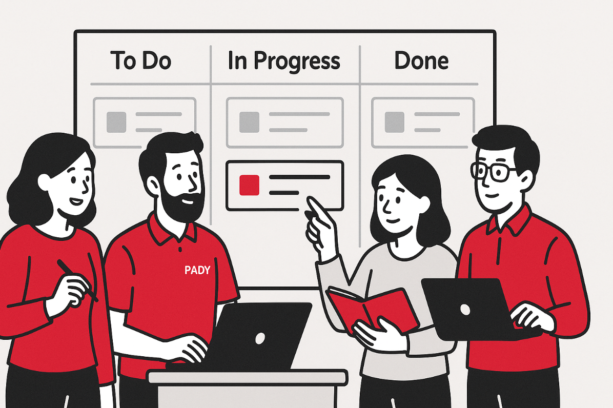PADY的設計、前端、項目經(jīng)理正在圍繞一個(gè)“看板式任務(wù)系統”進(jìn)行站會(huì )溝通。他們正在梳理任務(wù)狀態(tài):To Do、In Progress、Done。這個(gè)場(chǎng)景不僅體現了我們日常的工作流程,也恰恰是我們交付高品質(zhì)網(wǎng)站背后的秘訣。