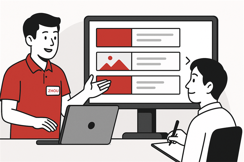 客戶(hù)邊聽(tīng)邊點(diǎn)頭,不時(shí)記錄要點(diǎn)。當周講到“這一塊圖片建議用你們車(chē)間實(shí)拍圖,而不是通用圖時(shí)”,客戶(hù)眼前一亮: