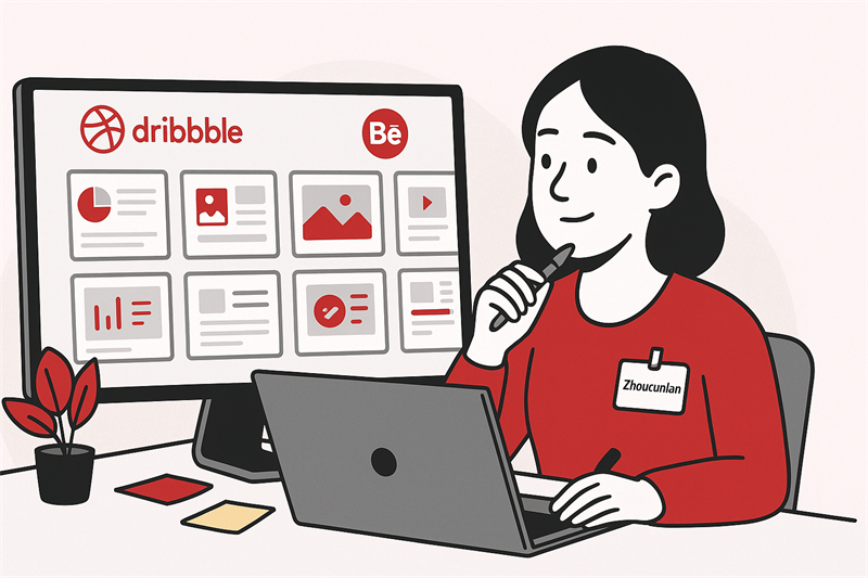 她正在為客戶(hù)制定首頁(yè)原型框架。屏幕上并非設計軟件,而是她熟悉的靈感平臺——Dribbble與Behance。她并不是在“抄界面”,而是在瀏覽全球優(yōu)秀項目中常見(jiàn)的布局邏輯、模塊節奏、信息編排方式。