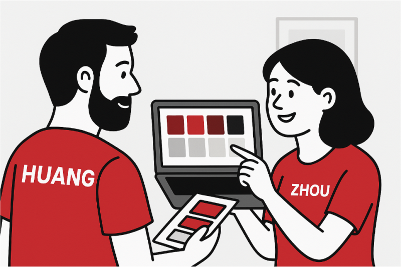 每一次配色方案的敲定,都是一次與品牌核心價(jià)值的深度對話(huà)。正如圖中Zhou指著(zhù)屏幕與Huang討論的那樣,他們不僅是在“選色”,而是在為客戶(hù)構建視覺(jué)戰略的根基。