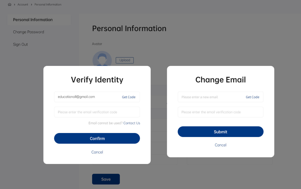 第二步,用戶(hù)填寫(xiě)新的郵箱地址,并再次接收新的驗證碼。這次的郵件發(fā)送到用戶(hù)輸入的新郵箱。用戶(hù)完成驗證碼填寫(xiě)并提交,驗證通過(guò)后,系統正式更新賬戶(hù)綁定的郵箱信息。