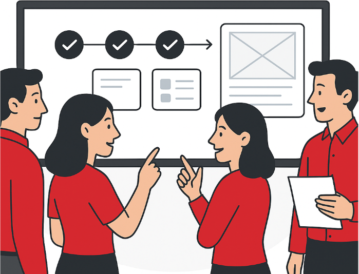 坐在桌邊的,是來(lái)自設計、前端開(kāi)發(fā)、內容策略和質(zhì)量保障的成員。每個(gè)人手中都拿著(zhù)項目打印件和結構說(shuō)明,有人敲著(zhù)筆記本記錄,有人翻閱資料標注流程。