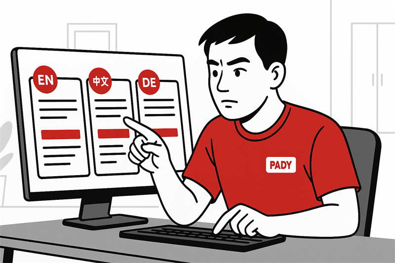 立刻預約圖中的這位,是我們派迪項目組的開(kāi)發(fā)工程師,正在對比中、英、德三種語(yǔ)言的網(wǎng)站頁(yè)面。他面前的電腦屏幕上,分別列出了三個(gè)語(yǔ)言入口,這正是我們日常建站中經(jīng)常遇到的場(chǎng)景之一: