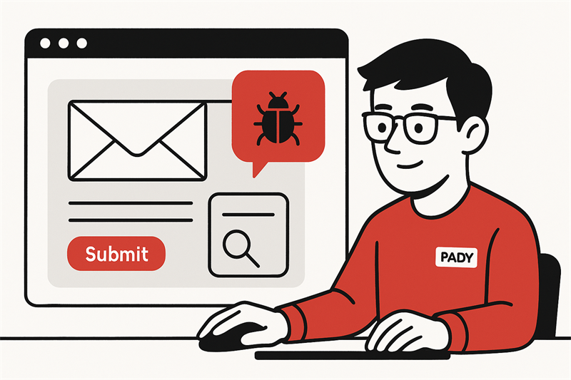 立刻預約一位身穿“PADY”工服的技術(shù)人員,正專(zhuān)注地盯著(zhù)電腦屏幕,處理頁(yè)面上的問(wèn)題。屏幕上彈出一個(gè)代表程序漏洞的“小蟲(chóng)子”圖標,表單下方是“Submit”按鈕,頁(yè)面還帶有搜索功能。這是網(wǎng)站開(kāi)發(fā)中再典型不過(guò)的一個(gè)場(chǎng)景:技術(shù)人員正在定位并修復一個(gè)用戶(hù)可能不會(huì )察覺(jué)的問(wèn)題。