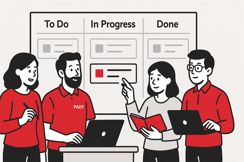立刻預約在當今快節奏的數字化工作環(huán)境中,項目管理方式正在不斷演變。圖中展示的是一個(gè)高效協(xié)作的場(chǎng)景:四位團隊成員正在圍繞一塊任務(wù)看板展開(kāi)討論。每個(gè)人都專(zhuān)注于手中的筆記本或記錄本,正在就項目進(jìn)展、任務(wù)分配與優(yōu)先級進(jìn)行溝通。這種工作方式,正是敏捷項目管理中的經(jīng)典應用——看板(Kanban)協(xié)作法。